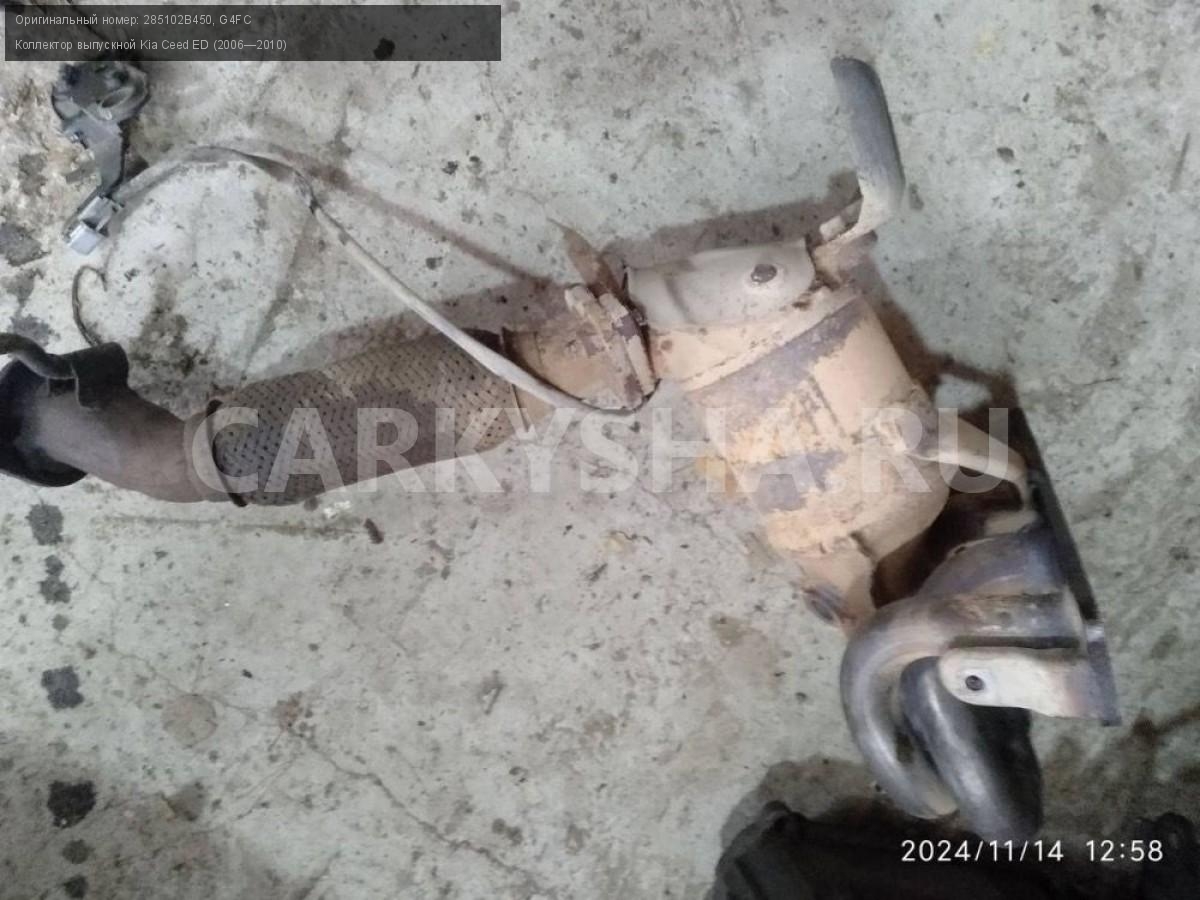 Kia Ceed ED, коллектор выпускной.\nАртикул: 6350\n\nОриг. номер: 285102B450\nНомера замен: G4FC\nПроизводитель: Hyundai-KIA\nПримечание:Киа Сид 1 ED, коллектор выпускной без катализатора, 1.6 F4FC, б/у. \n\nМарка: Kia\nМодель: Ceed ED (2006—2010)\nГод выпуска: 2007\nКузов тип: Хетчбэк\nДвигатель номер: G4FC\nМодель двигателя: инжектор\nОбъем: 1.6\nТопливо: Бензин\nКоробка: Автомат\nЦвет: Черный\nСовместимости: Kia Ceed ED (2006—2010) 1.6 AT (122 л.с.)\nСовместимость:
