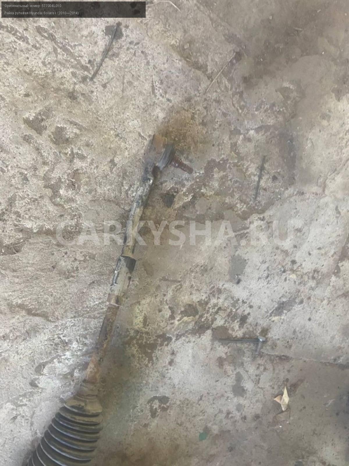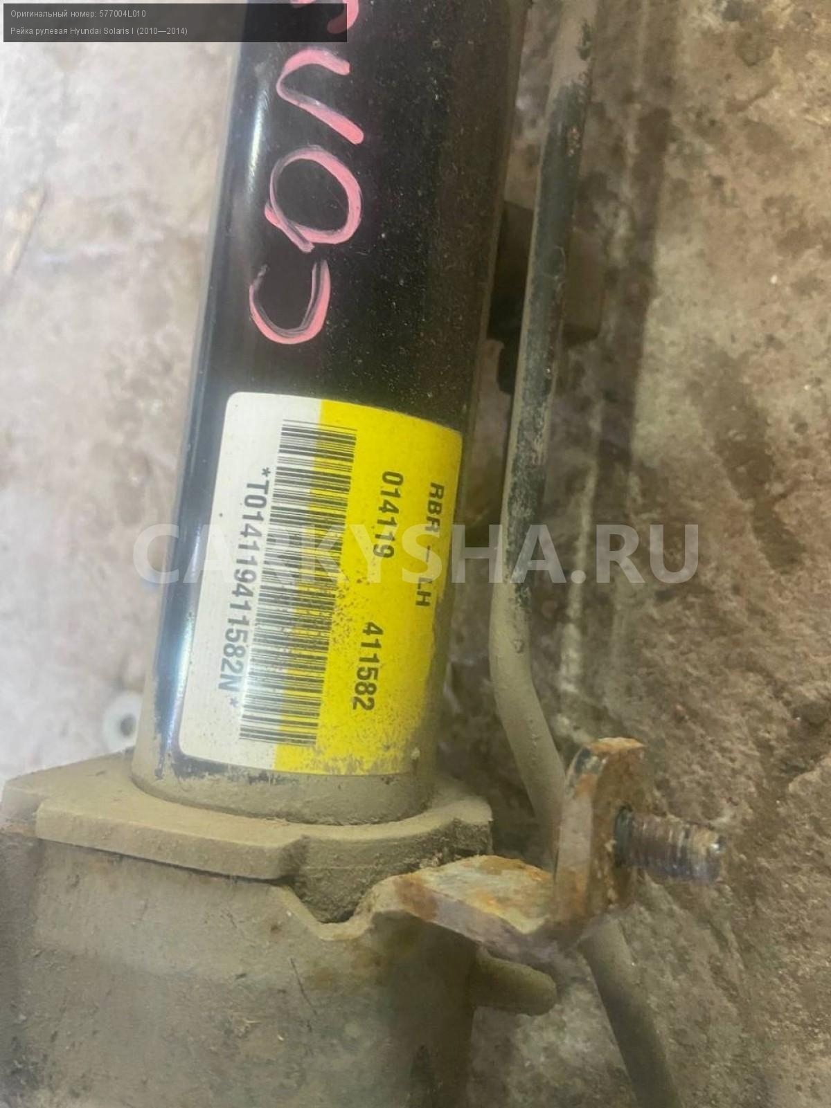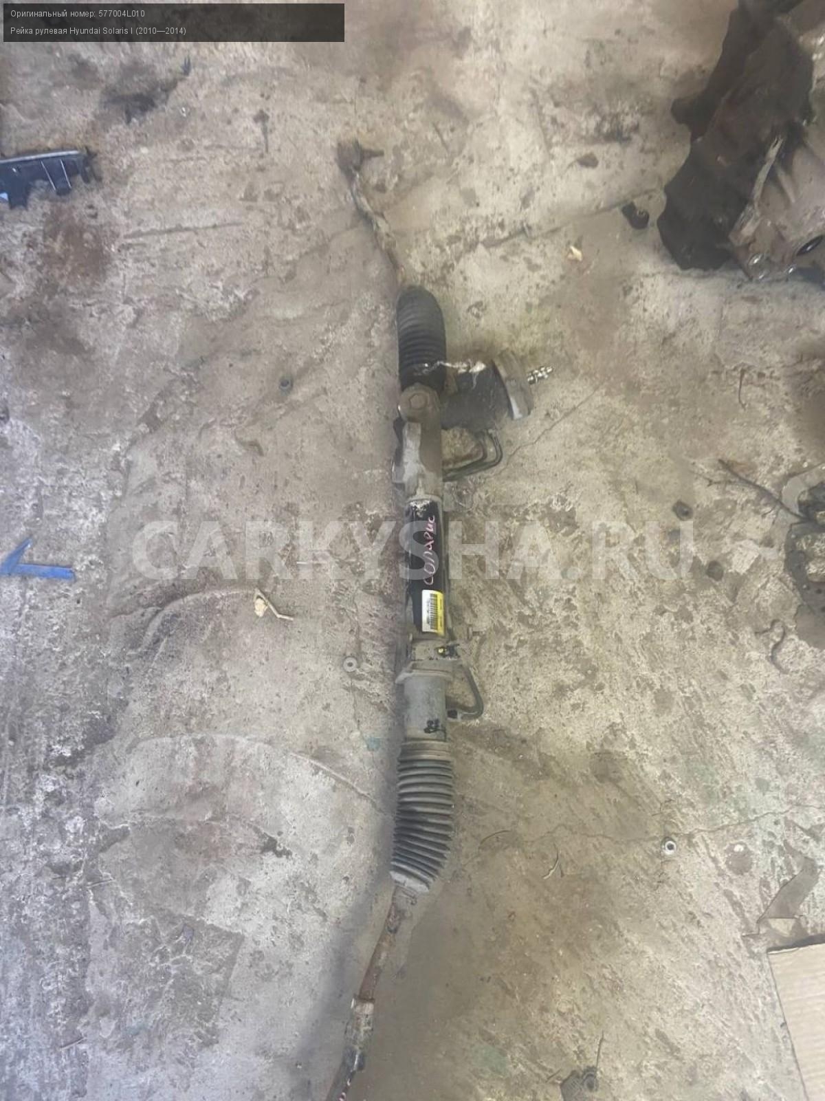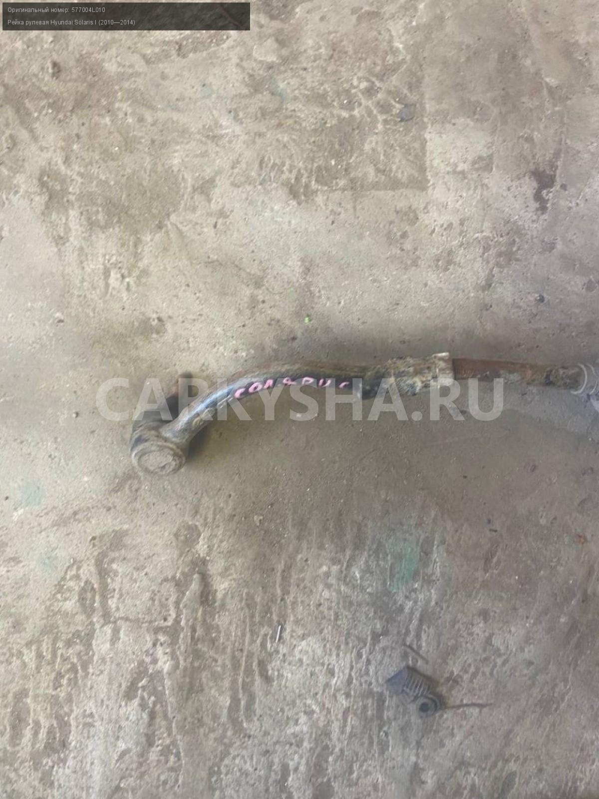 Hyundai Solaris I, рейка рулевая.\nАртикул: 7670\n\nОриг. номер: 577004L010\nПроизводитель: Hyundai-KIA\nПримечание:Хендай Солярис 1, рейка рулевая ( правый наконечник под замену) , б/у. \n\nМарка: Hyundai\nМодель: Solaris I (2010—2014)\nГод выпуска: 2014\nКузов тип: Седан\nДвигатель номер: G4FC\nМодель двигателя: инжектор\nОбъем: 1.6\nТопливо: Бензин\nКоробка: Механика\nЦвет: Черный\nСовместимости: Hyundai Solaris I (2010—2014) 1.6 MT (123 л.с.)\nСовместимость:
