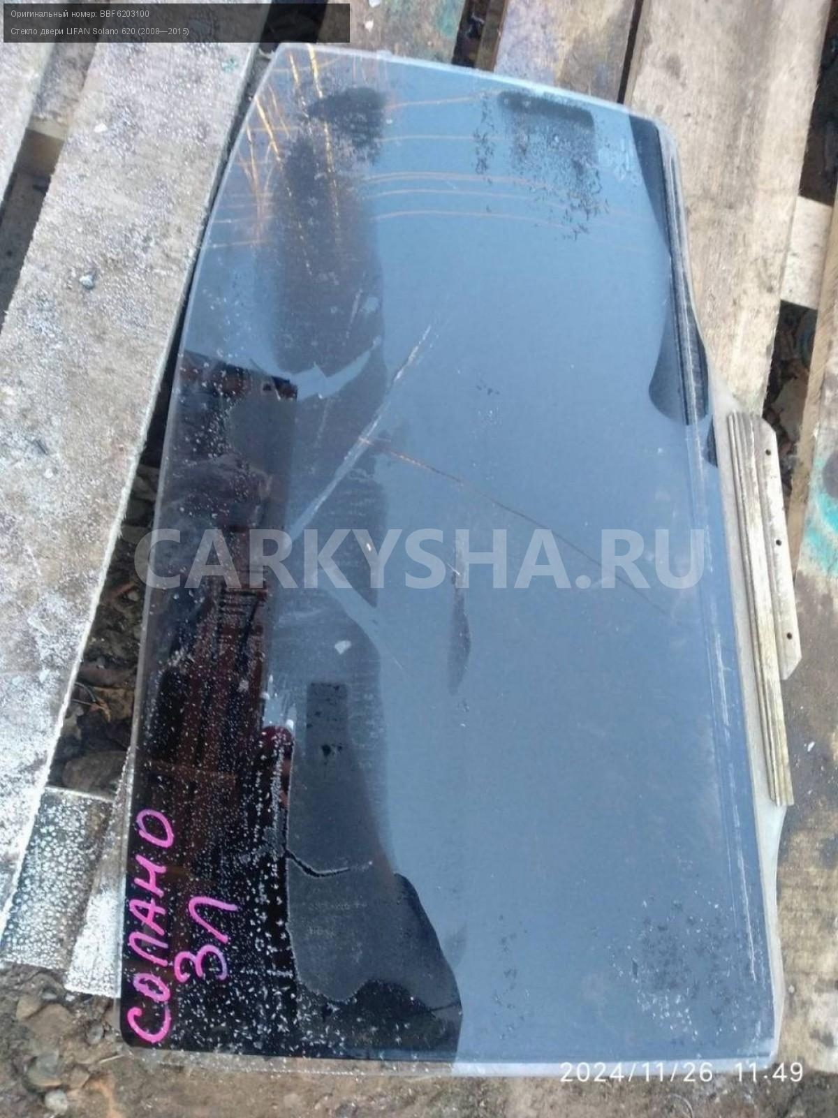 LIFAN Solano, стекло двери задней левой.\nАртикул: 6460\n\nОриг. номер: BBF6203100\nПроизводитель: LIFAN\nПримечание:Лифан Солано, стекло двери задней левой, б/у. \n\nМарка: LIFAN\nМодель: Solano 620 (2008—2015)\nГод выпуска: 2013\nКузов тип: Седан\nДвигатель номер: LF481Q3\nМодель двигателя: инжектор\nОбъем: 1.6\nТопливо: Бензин\nКоробка: Механика\nЦвет: Черный\nПраво/Лево: Лево\nПеред/Зад: Зад\nСовместимости: LIFAN Solano 620 (2008—2015) 1.6 MT (106 л.с.)\nСовместимость: