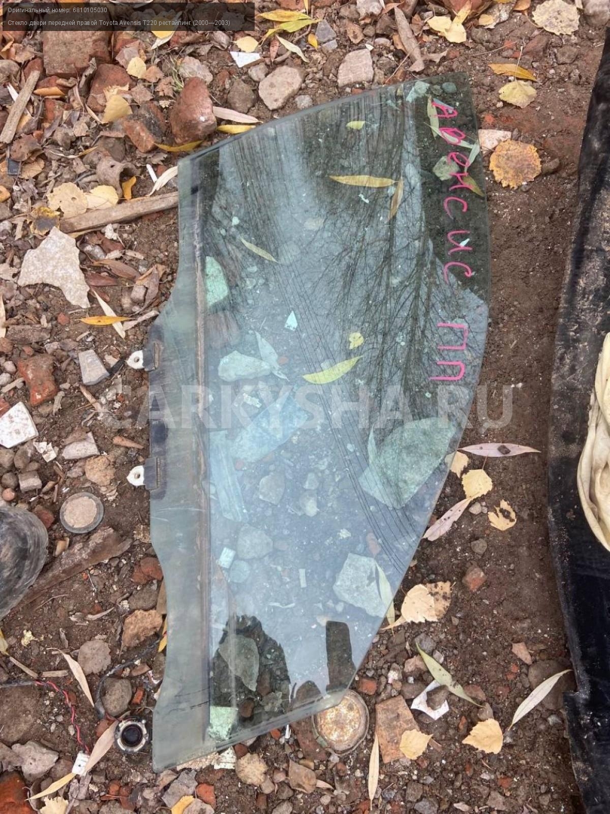 Toyota Avensis T220, стекло переднее правое.\nАртикул: 3621\n\nОриг. номер: 6810105030\nПроизводитель: TOYOTA\nПримечание:Тойота Авенсис Т 220, стекло двери передней правой, б/у. \n\nМарка: Toyota\nМодель: Avensis T220 рестайлинг (2000—2003)\nГод выпуска: 2001\nКузов тип: Седан\nДвигатель номер: 1ZZ-FE\nМодель двигателя: инжектор\nОбъем: 1.8\nТопливо: Бензин\nКоробка: Механика\nЦвет: Синий\nПраво/Лево: Право\nПеред/Зад: Перед\nСовместимости: Toyota Avensis T220 рестайлинг (2000—2003) 1.8 MT (129 л.с.)\nСовместимость: